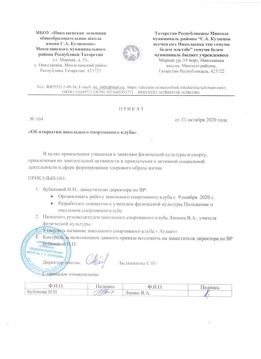Приказ ОУ № 134 "О создании школьного спортивного клуба «Атлант" от 31.10.2020
