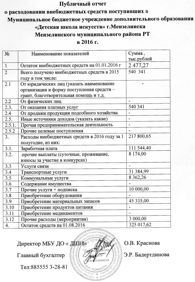 Публичный отчет о расходовании внебюджетных средств ДШИ за 2016 год