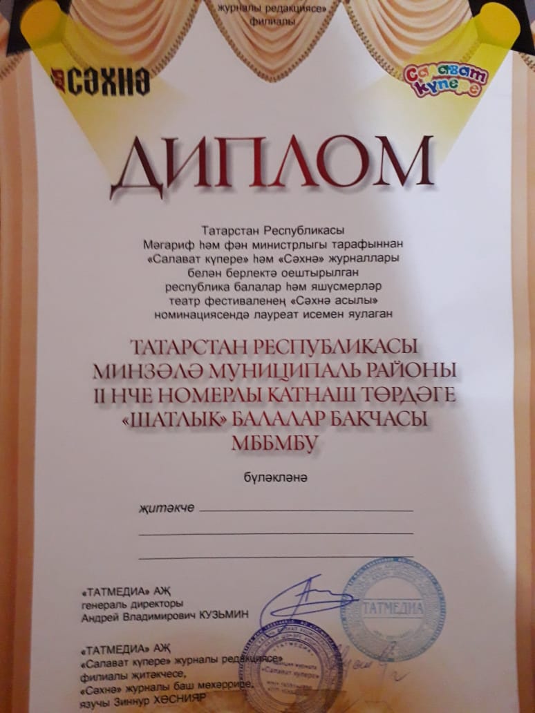 Воспитанники МБДОУ № 11 "Шатлык" (воспитатель Егорова Ф. Р.) приняли участие в Республиканском театральном фестивале "Сайяр", который организован совместно с Министерством образования и науки Республики Татарстан, журналами "Салават купере" и "Сәхнә" и стали лауреатами конкурса в номинации «Сәхнә асылы». ПОЗДРАВЛЯЕМ!!!