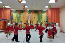 Дети радостно встречают своего любимого персонажа, исполняя песни, среди которых особое место занимает песня «Каравай».