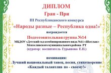 Поздравляем воспитанников подготовительной группы МБДОУ # 11 "Шатлык" (воспитатель Гурьянова Е. П.) с Гран- При в III Республиканском конкурсе "Народы разные-Республика одна!"
