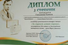 Поздравляем воспитанницу МБДОУ#11 "Шатлык" Гурьянову Елизавету (воспитатель Гурьянова Е. П.) с победой в региональном конкурсе чтецов "За строкой летит строка", посвященном 116 летию со дня рождения татарского поэта-героя Мусы Джалиля.