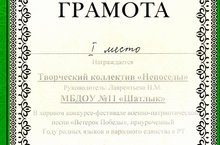Творческий коллектив "Непоседы" МБДОУ № 11 "Шатлык" занял 1 место в хоровом конкурсе-фестивале военно-патриотической песни "Ветерок Победы", приуроченный Году родных языков и народного единства в РТ
