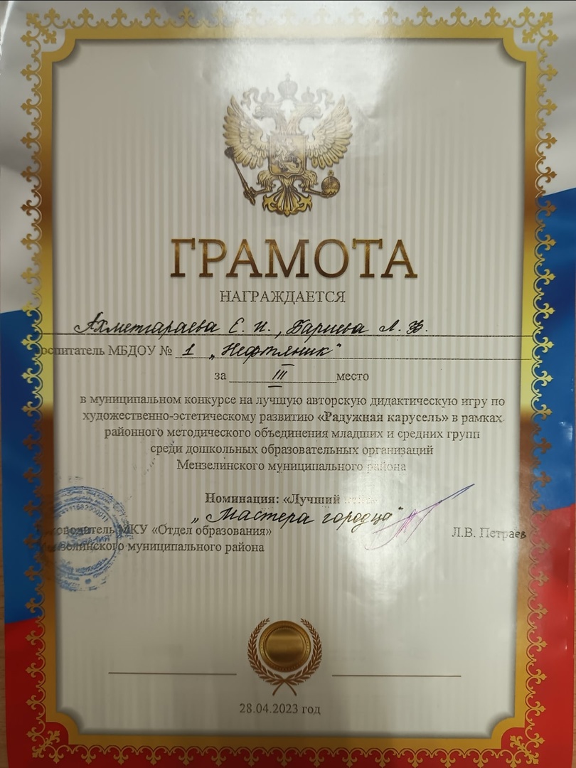 Воспитатели Ахметгараева Е. И., Бариева Л. Ф. принимали участие в конкурсе на лучшую авторскую дидактическую игру по художественно-эстетическому развитию «Радужная карусель». Номинация «Лучший кейс». Номинация «Лучший кейс»