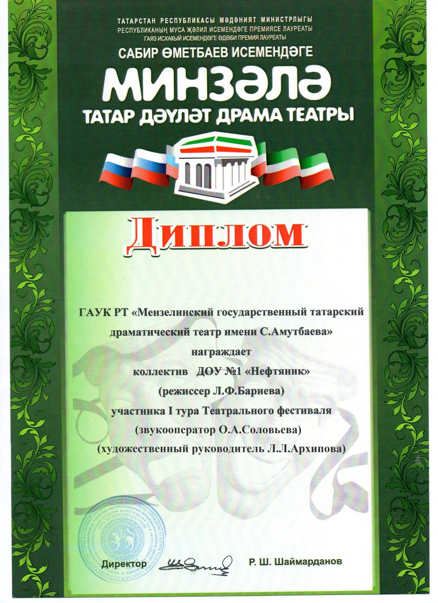 • Муниципальное бюджетное дошкольное образовательное учреждение "Детский сад общеразвивающего вида №1 "Нефтяник" Мензелинского муниципального района РТ/Татарстан Республикасы Минзәлә муниципаль районы «1нче номерлы гомүми үсеш тибындагы «Нефтче» балалар бакчасы» мәктәпкәчә белем бирү муниципаль бюджет учреждениесе