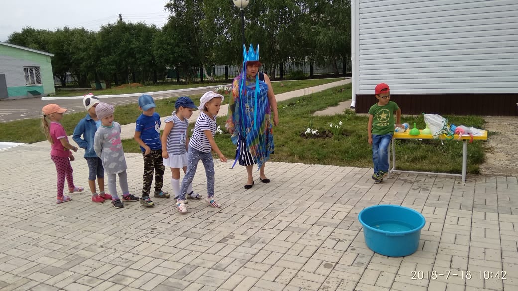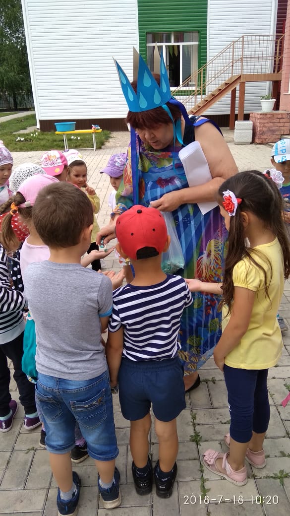 И малые пруды.Воспитатель Фролова Гузэлия Илгизовна провела развлечение "Бесценная и всем необходимая вода". В гости к ребятам пришла Царица Вода. С ней они читали стихи, играли в игры эстафеты: "Набери воды в бутылку", "Зонтики", "Ручеек", отгадывали загадки. За правильно выполненное задание дети получали капельки. Собравший больше всех капелек стал победителем. Все получили от Царицы Воды сладкие призы.