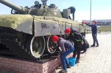 К празднованию Дня Победы организуется уборка на территориях Памятников Великой Отечественной войны. Юнармейским отделением Мензелинского муниципального района проведена помывка боевой техники на пьедесталах у памятника парка Победы. -