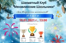 Во время зимних каникул шахматисты воспитанники МБУ ДО "ДДТ", учащийся МБОУ "СОШ №3" приняли участие во многих турнирах. Клубы "Наша Мензеля", "Мензелинск - Онлайн", "Мензелинские Школьники", (руководитель Шагалиев А.Т), "Шахматы Бавлы"(руководитель Коротаев Н.Н.) организовали для шахматистов турниры. 27 декабря "Ура Каникулы", "Лига РТ - личный", 27.12, 03.01, 10.01 "Улётный Вторник" -29.12, 05.01,"Финальный турнир для шахматистов СОШ №3" 30.12, "Новогодняя Пятница" 01.01.и др. Стали победителями: Зайнуллин Р., Юзыкаев Р., Акрамов К., Самерханов А. Призёры: Хамитов Л., Лазарев А., Искандиров И., Кузьмичёв М., Чуркина А.