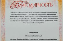 Родительский комитет школы № 3 выражает искреннюю благодарность педагогу Дома детского творчества Мыльниковой Наталье Николаевне за профессиональное мастерство, педагогический талант и душевную щедрость. Заняьтя педагога всегда познавательны и интересны. Их отличают талант педагога, преданность своей профессии и любовь к искусству.