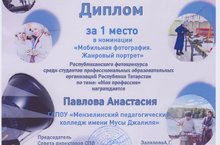 Студентка Мензелинского педагогичексого колледжа имени Мусы ДжалиляАнастасия Павлова стала обладателем 1 места в категории «Мобильная фотография», в номинации «Жанровый портрет». Благодарим преподавателя Минегалиеву Ильсияр Дамировну за подготовку победителя!