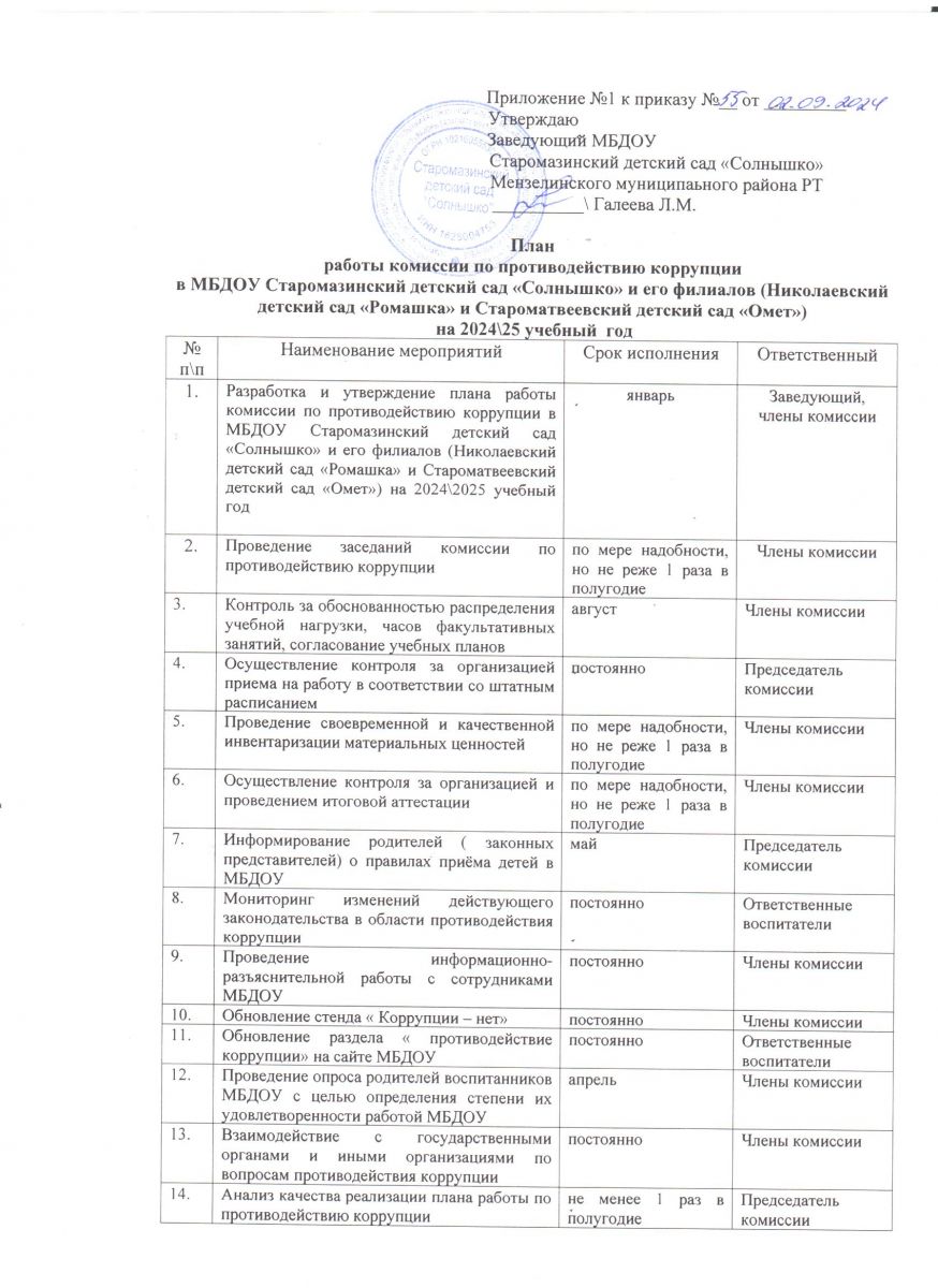 План работы комиссии по противодействию коррупции на 2024-2025 учебный год
