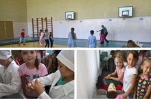 30 июня в пришкольном лагере был насыщенный день. Под руководством мед.сестры Розы Шариповны дети учились перевязывать пальчик, накладывать шину, обрабатывать рану и делать искусственное дыхание. Работники детской библиотеки провели увлекательное соревнование, а Флюс Раисович научил играть в "Перестрелки"