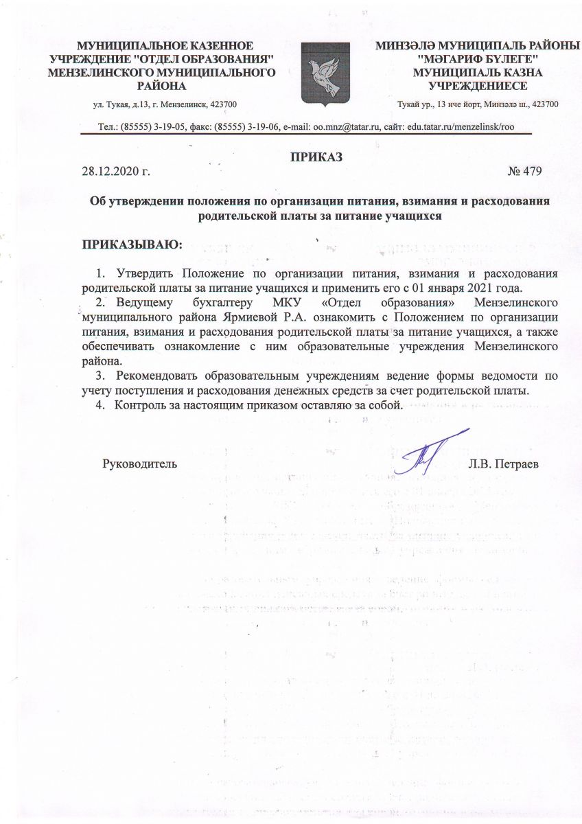 Приказ МКУ "Отде образования" №479 от 28.12.2020г. "Об утверждении положения по организации питания, взимания и расходования родительской платы за питание учащихся