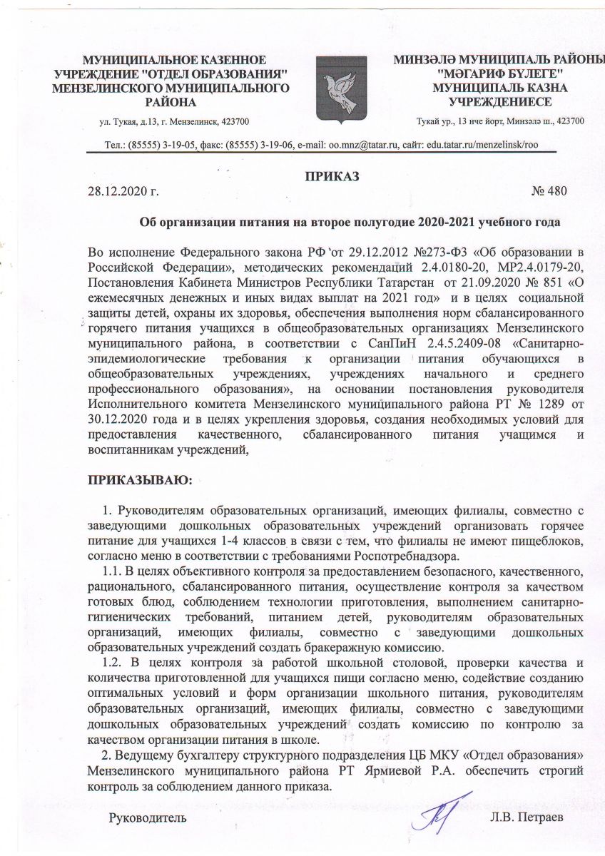 Приказ МКУ "Отдел образования" №480 от 28.12.2020г. "Об организации питания на второе полугодие 2020-2021 уч.года"