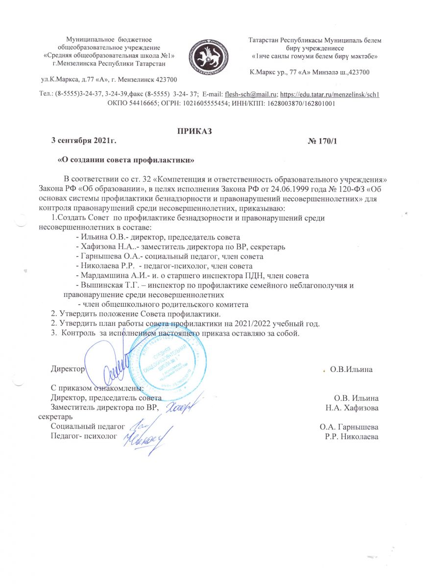 Приказ МБОУ "СОШ№1" от 03.09.2021 "О создании Совета профилактики"