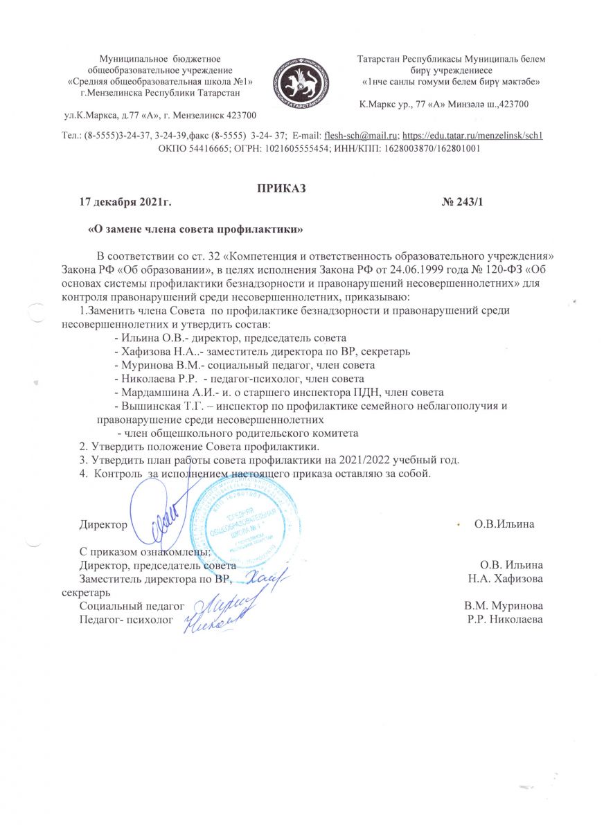 Приказ МБОУ "СОШ№1" от 17.12.2021 "О замене члена Совета профилактики"