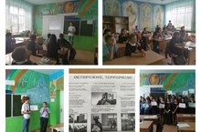21.09. совместно с представителями Молодежного центра «Веста» был проведен классный час в 6б классе (кл.рук. Кирилова А.М.) на тему «Экстремизму – нет!». В ходе классного часа были затронуты следующие вопросы: «Что такое экстремизм», «Какие террористические акты были в России», «Как вести себя, если вы попали в заложники», «Как сохранить мир на Земле». Была представлена презентация и видеоролик о терроризме. Также учащимся раздали информационные листовки о терроризме. В конце классного часа учащиеся представили свои рисунки и высказали свое мнение по данной теме.
