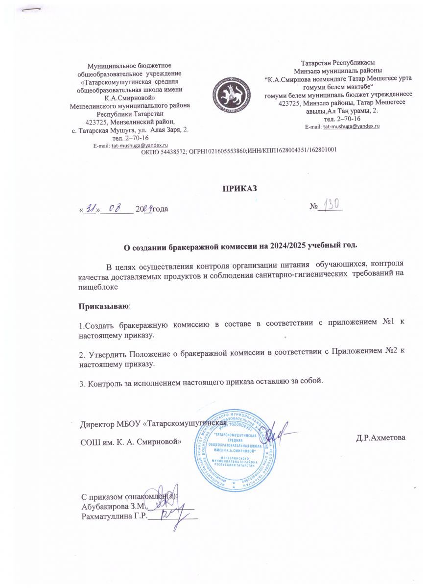 Приказ МБОУ "Татарскомушугинская СОШ имени К.А. Смирновой" об утверждении стоимости питания и сбора родительской платы с 1 сентября 2025-2026 учебного года