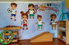 Недавно в нашем спортзале обновилась стена, которую украшают маленькие спортсмены, даря улыбку и радость детям, занимающимся утренней зарядкой