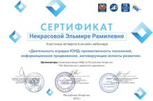 Воспитатель МБДОУ "Юртовский детский сад" Некрасова Эльмира Рамилевна приняла участие в онлайн -вебинаре "Деятельность отрядов ЮИД: преемственность поколений,информационное продвижение, мотивирующие аспекты развития", и получила сертификат участника