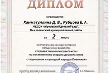 Воспитатель Хамматуллина Дарья и Рубцова Екатерина получили диплом занявшее 2 место в региональном конкурсе авторских методических разработок «Игровая технология (квест игра) по ознакомлению старших дошкольников с творчеством и культурой народов Поволжья».