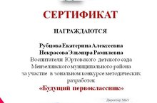 Воспитатели Рубцова Екатерина Алексеевна и Некрасова Эльмира Рамилевна получили сертификат участника в зональном конкурсе методических разработок "Будущий первоклассник"