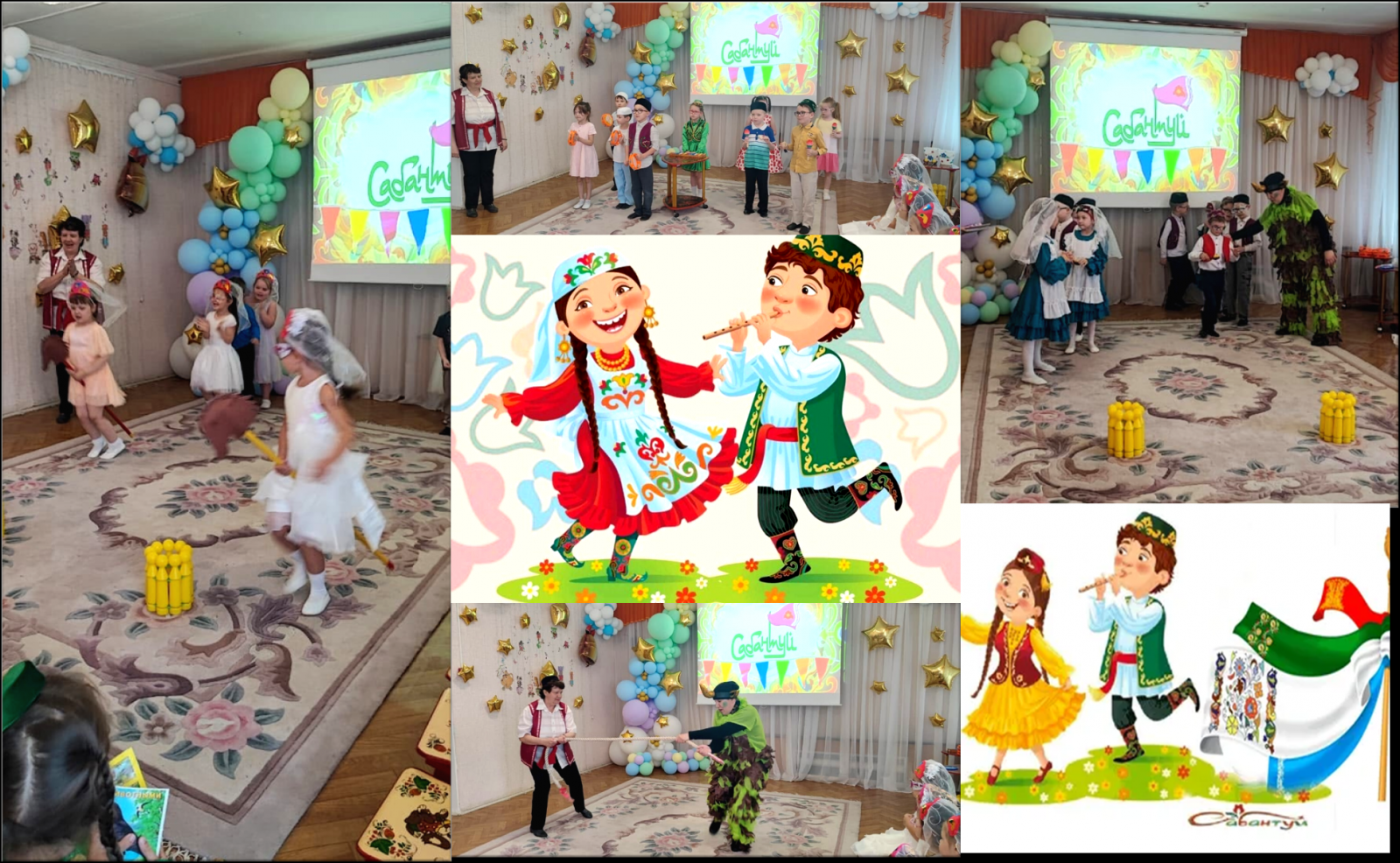 Сабантуй – это праздник плодородия и изобилия, праздник труда, праздник радости и счастья, в котором сливаются воедино и красивые обычаи народа, и песни его, и пляски, и обряды. Веселое празднование праздника Сабантуй в детском саду начали с национальных песен и плясок. Ребята показали свою ловкость и умения в национальных играх «Перенеси яйцо в ложке», «Перетяни канат», «Конные скачки». У маленьких участников Сабантуя надолго останутся незабываемые впечатления об этом красивом национальном празднике.
