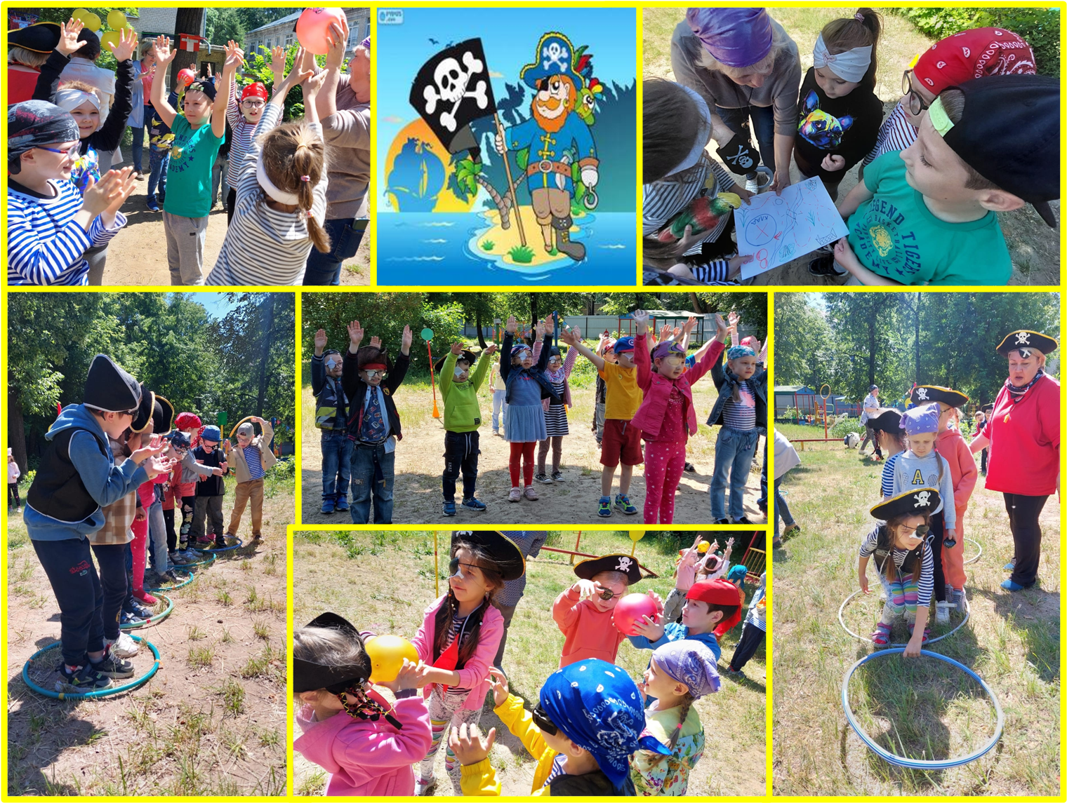 Сегодня у нас в детском саду прошёл спортивный праздник «Приключения пиратов». Ребята отправились в сказочное путешествие на поиски клада. Ребята сделали «Пиратскую зарядку», отгадали трудные загадки, поиграли в игры и преодолели множество весёлых эстафет вместе с пиратом