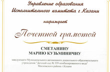 Сметанина Мария Кузьминична, заведующий МАДОУ "Детский сад № 339" награждена Почетной грамотой Управления образования Исполнительного комитета г.Казани за весомый вклад в обучение и воспитание подрастающего поколения, плодотворный труд в сфере дошкольного образования.