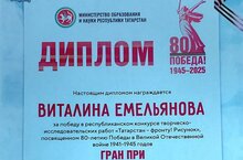 Поздравляем с награждением Дипломом Министерства Образования и Науки Республики Татарстан, Емельянову Виталину, воспитанницу подготовительной к школе группы №4 и воспитателя Скварцову Татьяну Николаевну, за Победу в конкурсе творческо-исследовательских работ "Татарстан - фронту! Рисунок" Посвященном 80-летию Победы в Великой Отечественной войне1941-1945 годов.