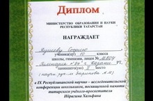 Поздравляем ученицу 10 класса Яушеву Софию, занявшую II место в IX Республиканской научно-исследовательской конференции школьников, посвященной пвмяти татарского ученого-просветителя Ибрагима Хальфина (научный руководитель Зарипова айгуль Мидхатовна), 08.02.2014.