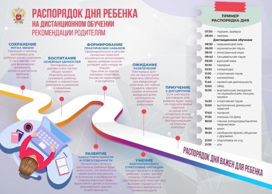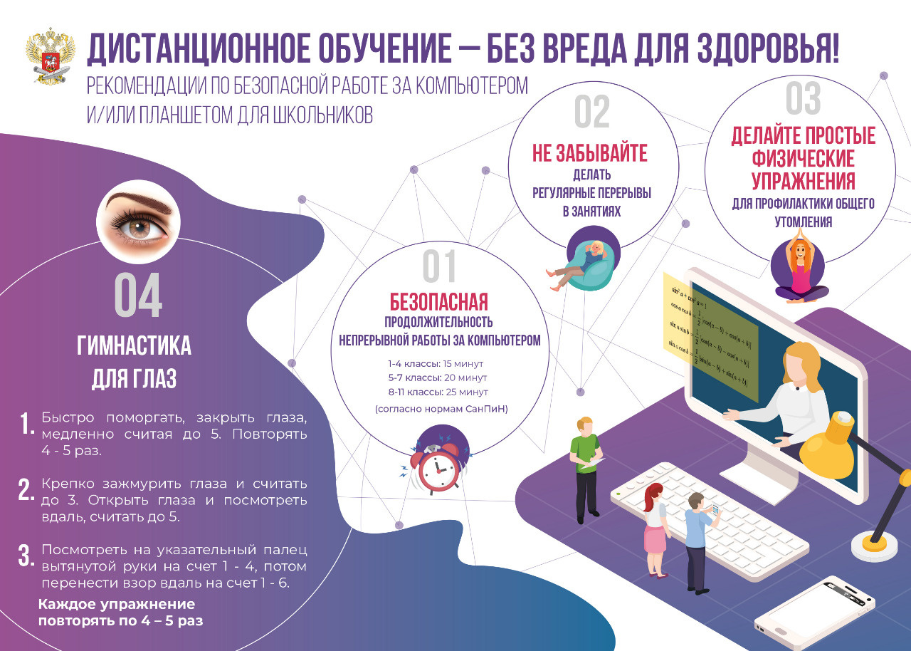 В соответствии с переходом на дистанционное обучение в целях сохранения здоровья школьников и правильной организации режима дня Министерство просвещения Российской Федерации разместило инфографику с рекомендациями для школьников и родителей по ведению здорового образа жизни в период дистанционного обучения.