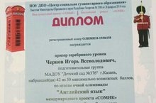 Будем делиться нашими юными призерами и победителями, которые не только в стенах детского сада добиваются больших успехов. Поздравляем воспитанника 6 группы Чернова Игоря - призера серебряного уровня очной олимпиады "Английский язык" международного проекта "СОМИК".