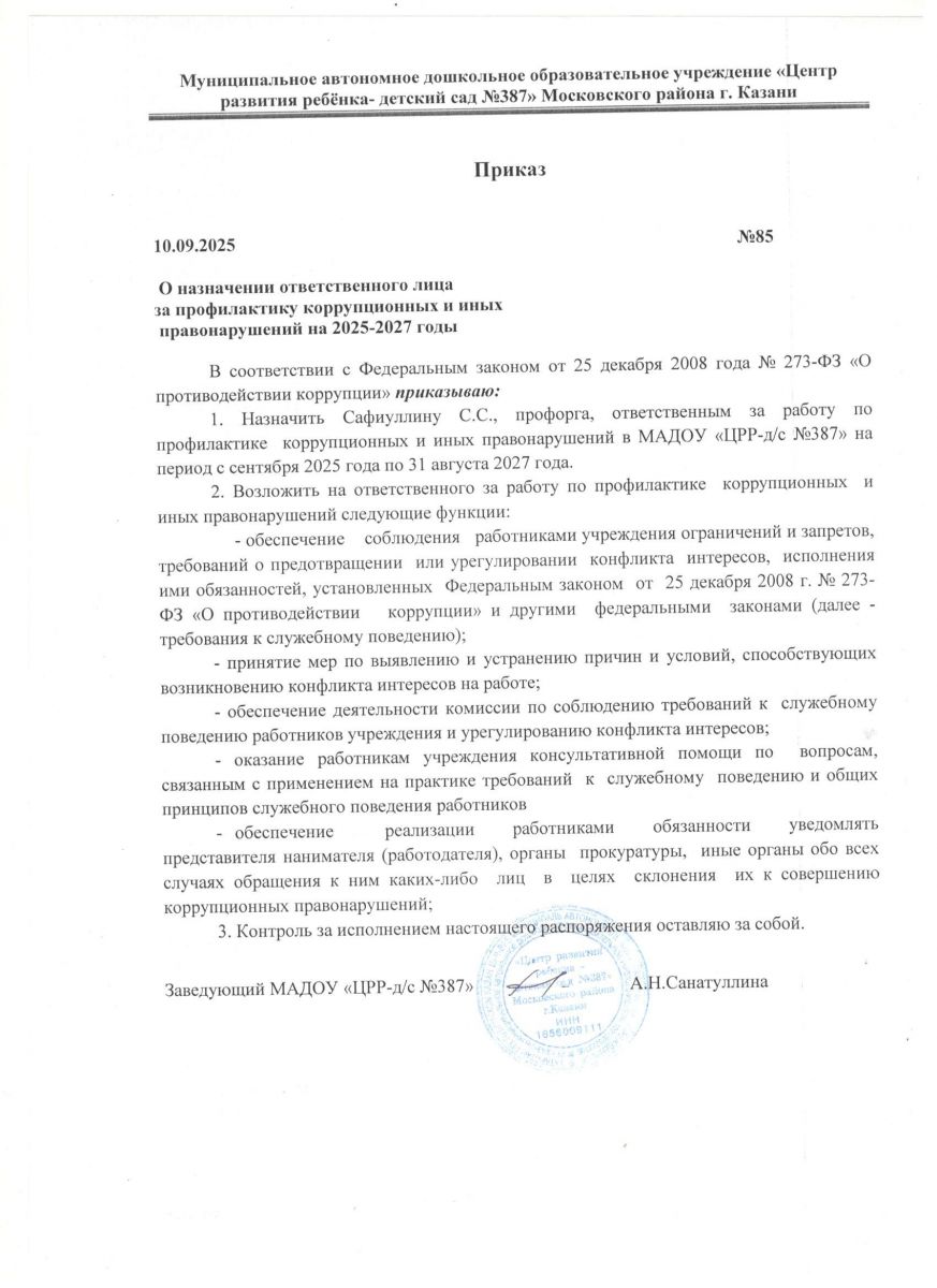 Приказ о назначении ответственного лица за профилактику коррупционных и иных правонарушений