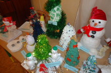 В детском саду работает выставка поделок "Мастерская Деда Мороза". Родители с детьми изготовили много елочек и снеговиков из различного материала.