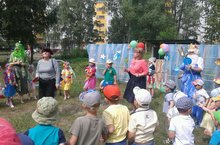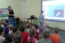24 июля дети путешествовали в космическом пространстве вместе с ведущей развлечения воспитателем Зиганшиной Г.Г., Лунатиком и Звездочетом (роли которых исполнили воспитатели Сафиуллина А. А., Гамирова Э.Х.). Космическое путешествие получилось интересным и занимательным. Ребята обобщили свои знания о космосе, полученные в течение года и летней тематической недели. Дети занимались подготовкой в космонавты в игре: "Наш дружный экипаж", исполнили танец "Я-ракета", спасли Луну и Лунатика, отгадав сложные загадки пришельцев. Звездочету помогли навести порядок на орбите, играя в музыкальную игру: "Парад планет". Соревновались в умении испытывать невесомость (стоя на одной ноге) в открытом космосе и исследовали неизвестную планету (прыгая с островка на островок). Всем было весело!