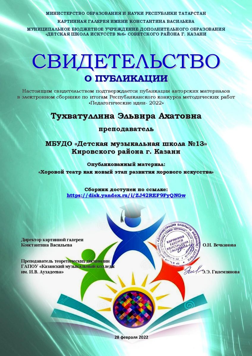 Тухватуллина Э.А. Хоровой театр как новый этап развития хорового искусства (стр.151) Свидетельсво о публикации