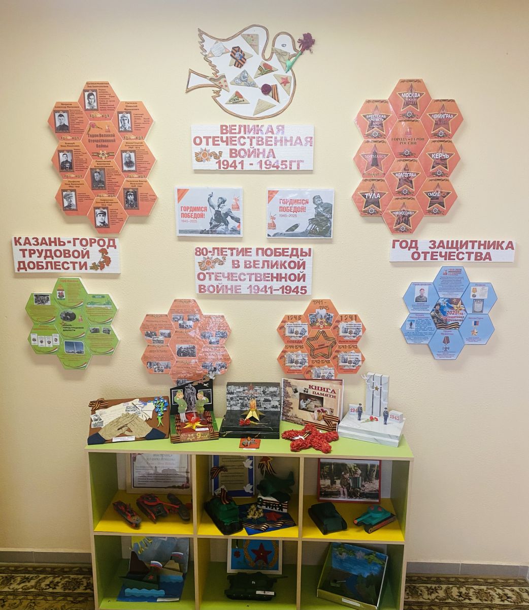 В канун праздника Великой Победы в нашем детском саду организована выставка, посвященная Великой Отечественной войне «Никто не забыт, ничто не забыто!», созданная детьми, родителями и педагогами с целью формирования у дошкольников чувство патриотизма, любви к своей Родине и уважения к людям, которые ковали Победу и оформлены информационные стенды "Год защитника Отечества", "80-летие Победы в Великой Отечественной войне 1941-1945гг", "Казань-город трудовой доблести"