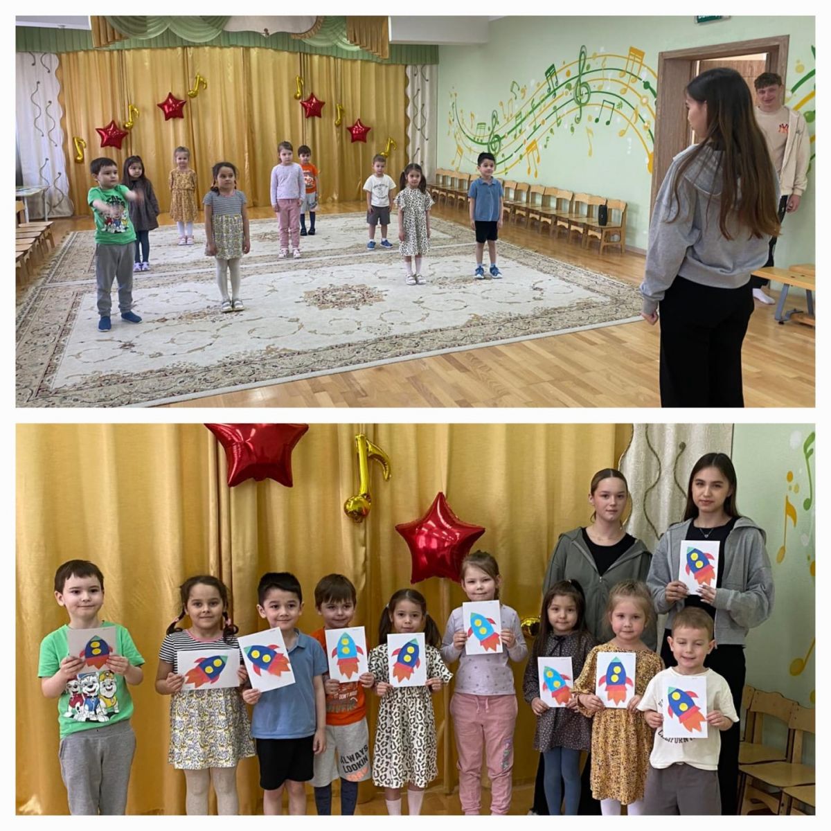11 апреля ученики 55 школы, в рамках Движения первых, провели с воспитанниками старшей группы № 6 мероприятие, посвящённое Дню космонавтики. Ребята сделали аппликацию "Ракета", поиграли и потанцевали.
