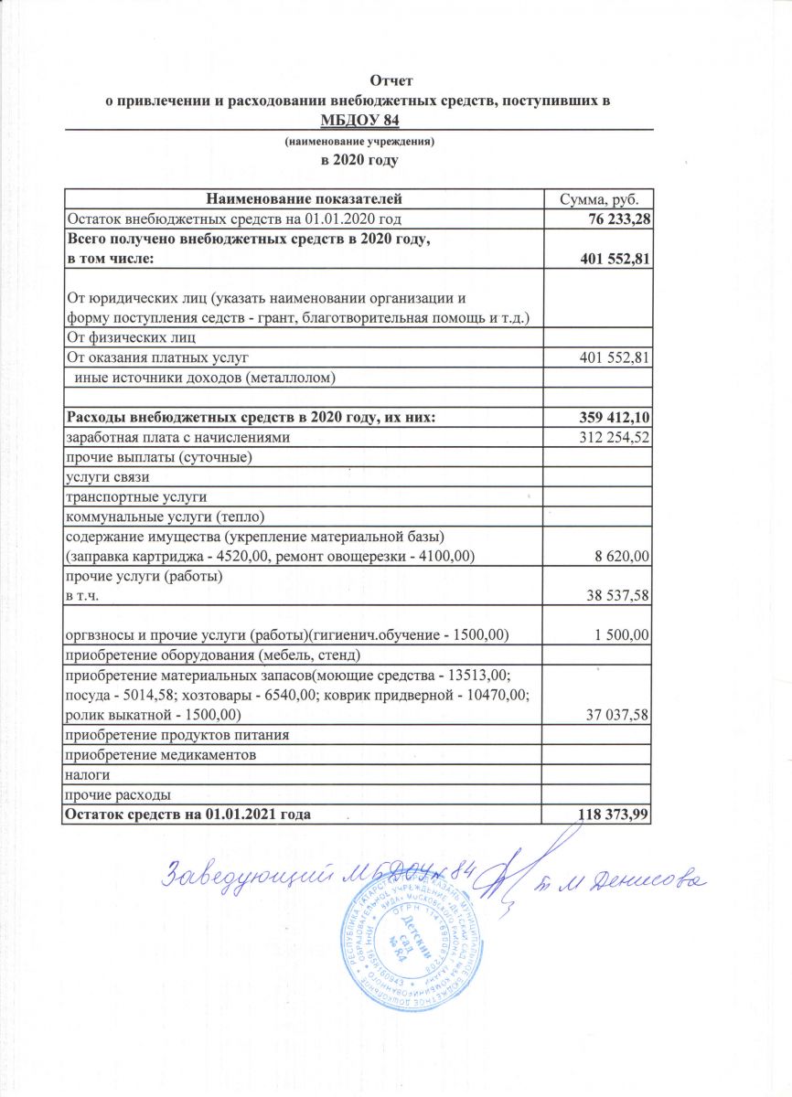 Отчет о привлечении и расходовании внебюджетных средств, поступивших в МБДОУ № 84 в 2020 году.