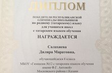 Ученица 8 А класса Диляра Салахиева стала победителем республиканской олимпиады по татарскому языку! Наши поздравления победителю и преподавателю татарского языка и литературы М.Н. Валиевой! Молодцы!