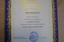 Награждается команда школы №65 руководитель (Насирова.Л.Х) за активное участие в районном конкурсе юных краеведов «Казань – вчера, сегодня, завтра». Молодцы!