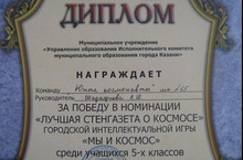 Муниципальное учреждение "Управление образования Исполнительного комитета муниципального образования города Казани" награждает команду "Юные космонавты" школы № 65 (руководитель Шарафеева.Л.Ш) за победу в номинации "Лучшая стенгазета о космосе" городской интеллектуальной игры "МЫ И КОСМОС" среди учащихся 5-х классов.
