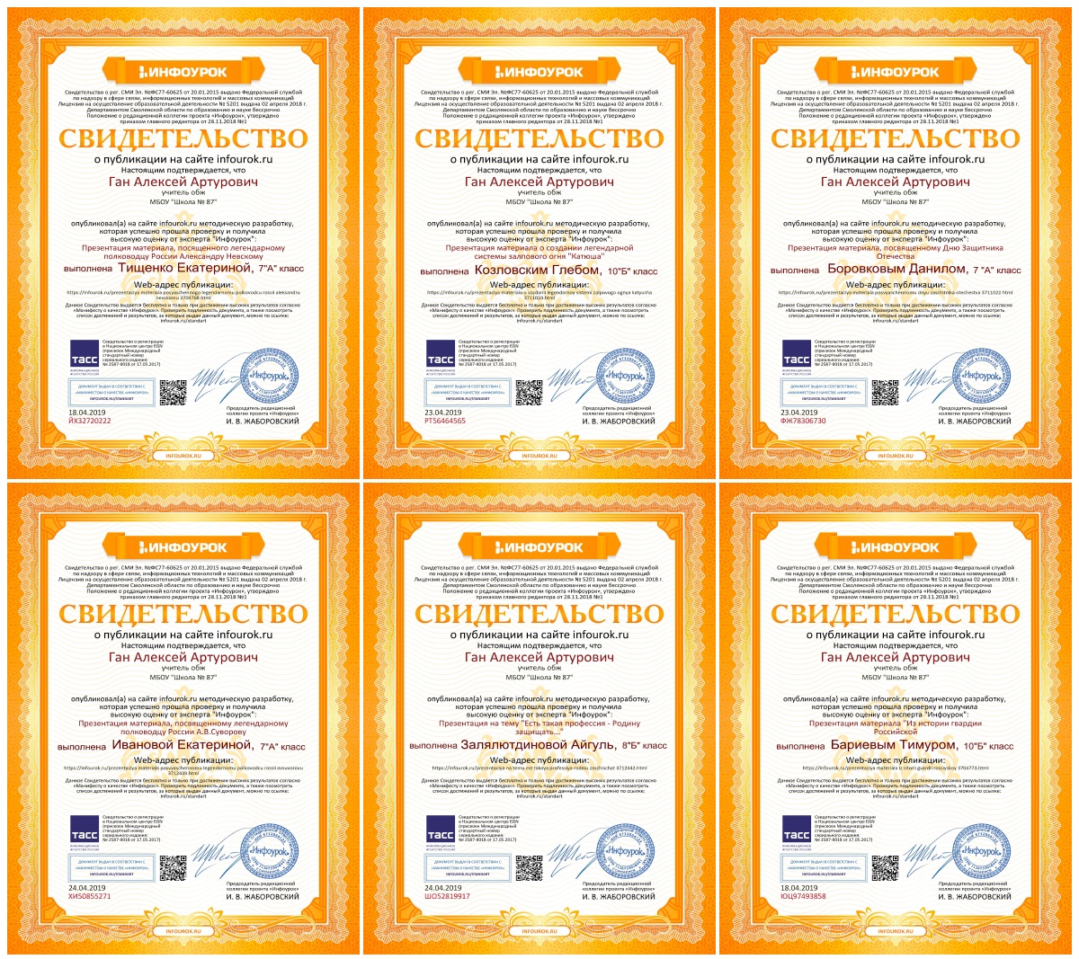 Все письменные работы наших школьников, направленные на конурс «Есть такая профессия – Родину защищать», успешно прошли проверку на авторство и опубликованы на сайте «Инфоурок». Вот такие свидетельства о публикации получают авторы: