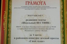 ПОЗДРАВЛЯЕМ редакцию газеты "Школьный Вестник" за 1 место в районном конкурсе детской прессы "Свой голос"