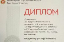 Гимназиянең 11А сыйныфы укучысы Гөлнара Габдуллина Россия күләмендә уздырылган "XXI гасырда әдәбият гыйлеме һәм эстетика" ("Татьянин день") фәнни-гамәли конференциядә уңышлы катнашып 3 нче урынны яулады (җитәкчесе - Бушуева А.Д.).