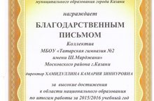 Гимназия коллективы 2015-2016 нчы уку елындагы милли мәгариф өлкәсендәге югары казанышлары өчен Казан шәһәре Мәгариф идарәсенең рәхмәт хаты белән бүләкләнде.