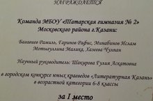 Гимназиябезнең укучылар командасы (Р.Баһавиев, Р.Гарипов, И.Минабинов, М.Мотыйгуллина, Ч.Хаҗиева) шәһәр күләмендә уздырылган "Әдәби Казан" - "Литературная Казань" туган якны өйрәнүчеләр конкурсында 1 нче урынны яуладылар. Җитәкчеләре - Шакирова Г.Ә. Укучыларыбызны котлыйбыз!