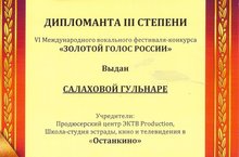 Ученица 11А класса Г.Салахова стала Дипломантом III степени VI Международного вокального фестиваля-конкурса "ЗОЛОТОЙ ГОЛОС РОССИИ".