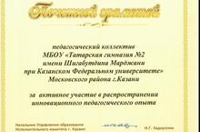 Ш.Мәрҗани исемендәге 2 нче татар гимназиясе коллективы Казан шәһәре Мәгариф идарәсе Башкарма комитеты тарафыннан инновацион педагогик тәҗрибә таратуда актив катнашканы өчен Почет грамотасы белән бүләкләнде.